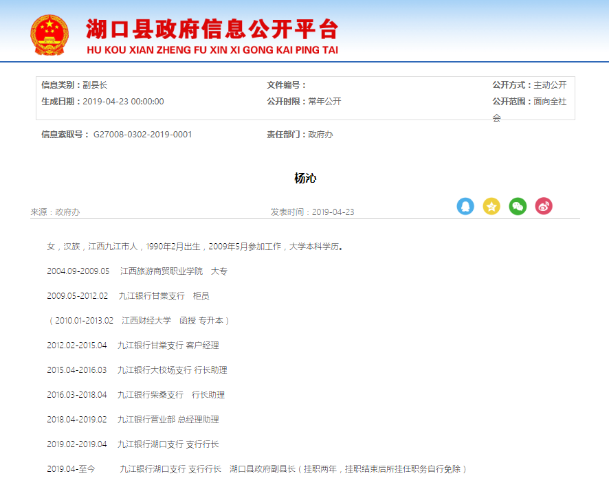 此前,据湖口县政府信息公开平台显示,该县副县长杨沁,女,汉族,江西九江市人,1990年2月出生,2009年5月参加工作,大学本科学历。杨沁简历显示,2019年4月至今,任九江银行湖口支行行长挂职湖口县政府副县长(挂职两年,挂职结束后所挂任职务自行免除)。