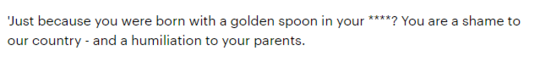 “你觉得钱没用是因为你含着金汤匙出生的,你是我们国家的耻辱,是你父母的耻辱。”