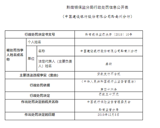 新浪财经讯 12月16日消息,黔南银保监分局近日发布行政处罚信息公开表显示,中国建设银行(7.210,-0.04,-0.55%)股份有限公司黔南州分行因贷款支付不合规被罚款30万元。