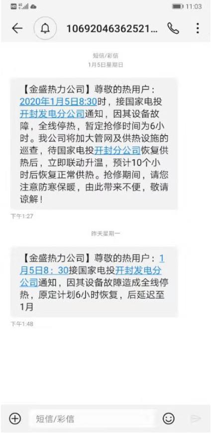 原来,在1月5日,开封市区热用户陆续接到接到金盛热力的短信提醒:2020年1月5日8:30时,接国家电投开封发电分公司通知,因其设备故障,全线停热,暂定抢修时间为6小时。这条信息里承诺热用户在热源侧抢修完毕后预计10小时后恢复供热。然而,实际情况并非如此。