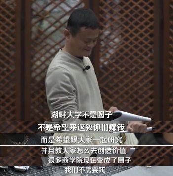 马云表示,湖畔大学不是圈子,是一个交流的地方,要有自己坚持的东西。他说,“我们不做企业家圈子,不是希望教你们赚钱,而是希望和大家一起交流、研究如何创造价值。很多商学院到最后都成为了圈子,而湖畔大学不需要这种圈子,不需要钱和项目。湖畔大学的学员只会找到一批同样有理想、有情怀、有痛苦、有烦恼的创业者,互相学习。